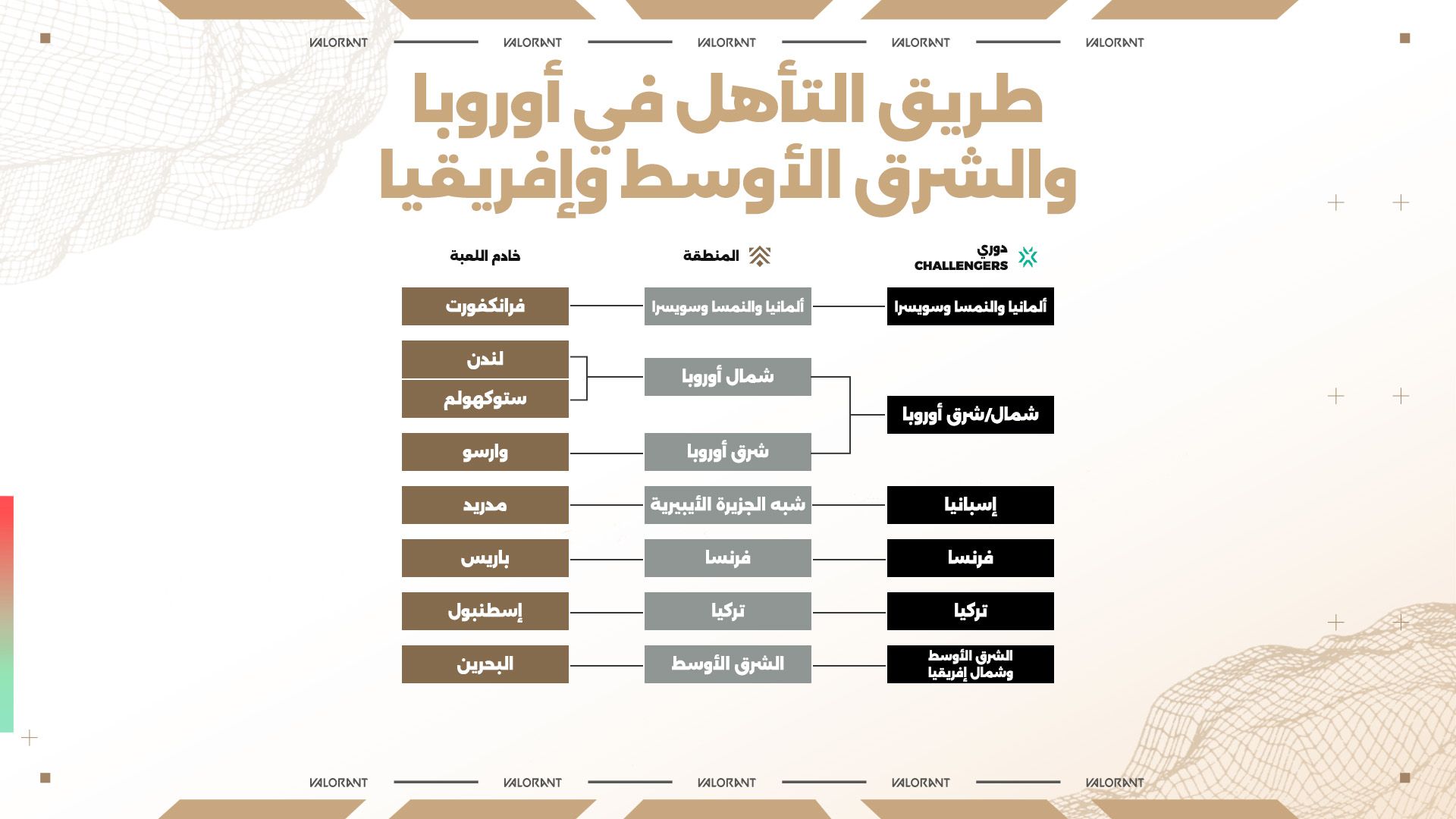 في منطقة أوروبا والشرق الأوسط وأفريقيا، سنُقيم بطولة Challengers أوروبا والشرق الأوسط وأفريقيا مرة أخرى وسنستخدم النقاط والمراكز من تلك البطولات كطريقة لتأهل أفضل أربعة مصنفين.