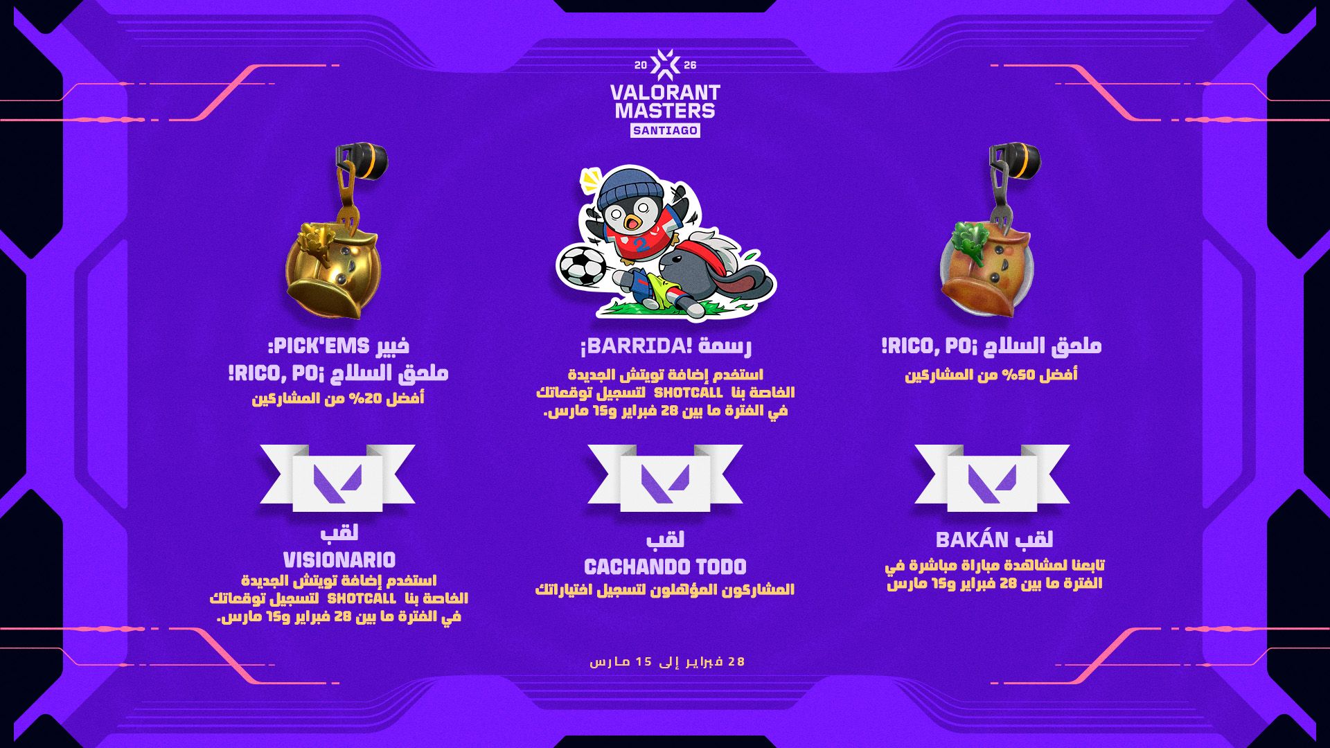 ستتضمن بطولة Masters Santiago أيضًا Shotcall، وهي إضافة مباشرة على منصة تويتش تتيح لك توقع ما سيحدث لاحقًا في أثناء البث الرسمي لمباريات valorant champions tour. توقع نتائج الخرائط، والجولات، ولحظات الحسم في الوقت الفعلي، واجمع النقاط بناءً على دقة توقعاتك لتتسلق جدول الترتيب العالمي. تتوفر الميزة لمستخدمي الحاسوب عبر إضافة تويتش.