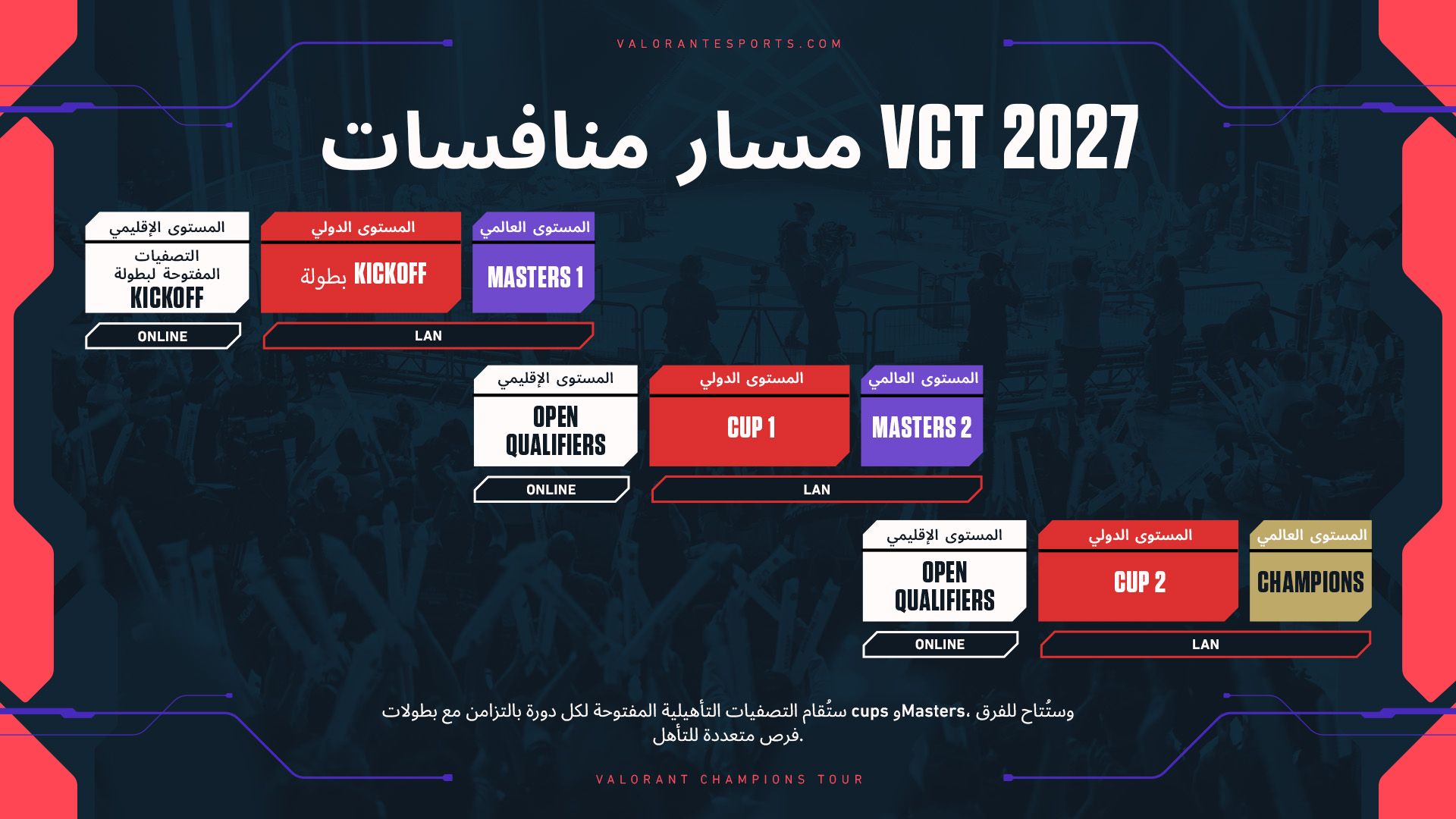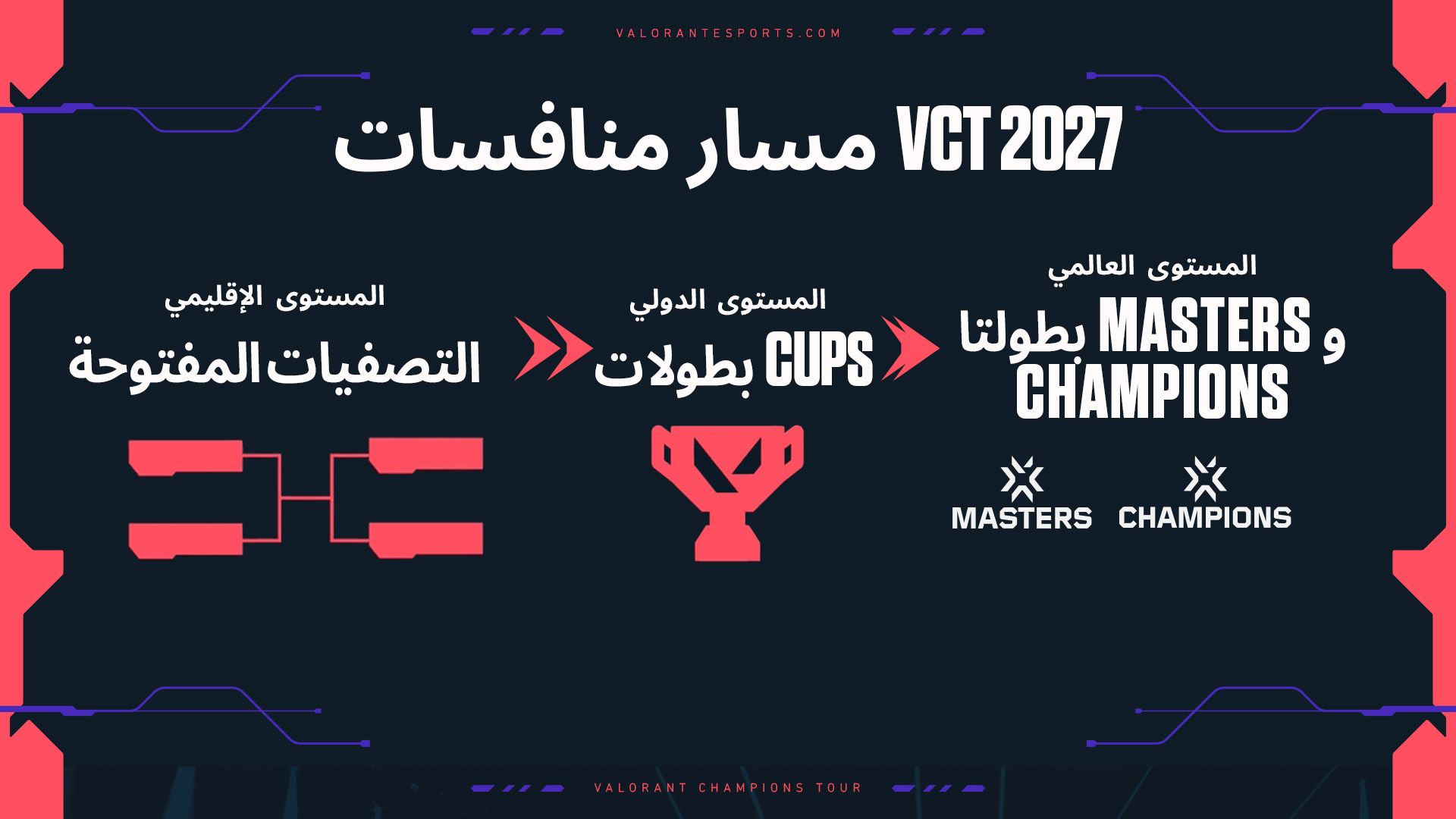 نشارك اليوم أول تحديث ضمن سلسلة من التحديثات بشأن التغييرات التي ستشهدها في رياضات VALORANT الإلكترونية العام المقبل. في عام 2027، ستتحوّل valorant champions tour إلى نموذج بطولات سيقدّم مزيدًا من اللحظات العالية المخاطر على مدار الموسم، وفعاليات جديدة أقرب إليك، وطرقًا جديدة تتيح لأي فريق التأهل إلى فعاليتي valorant champions tour العالميتين: بطولتا Masters وChampions. سيركّز هذا الهيكل الجديد على المبادئ التالية: