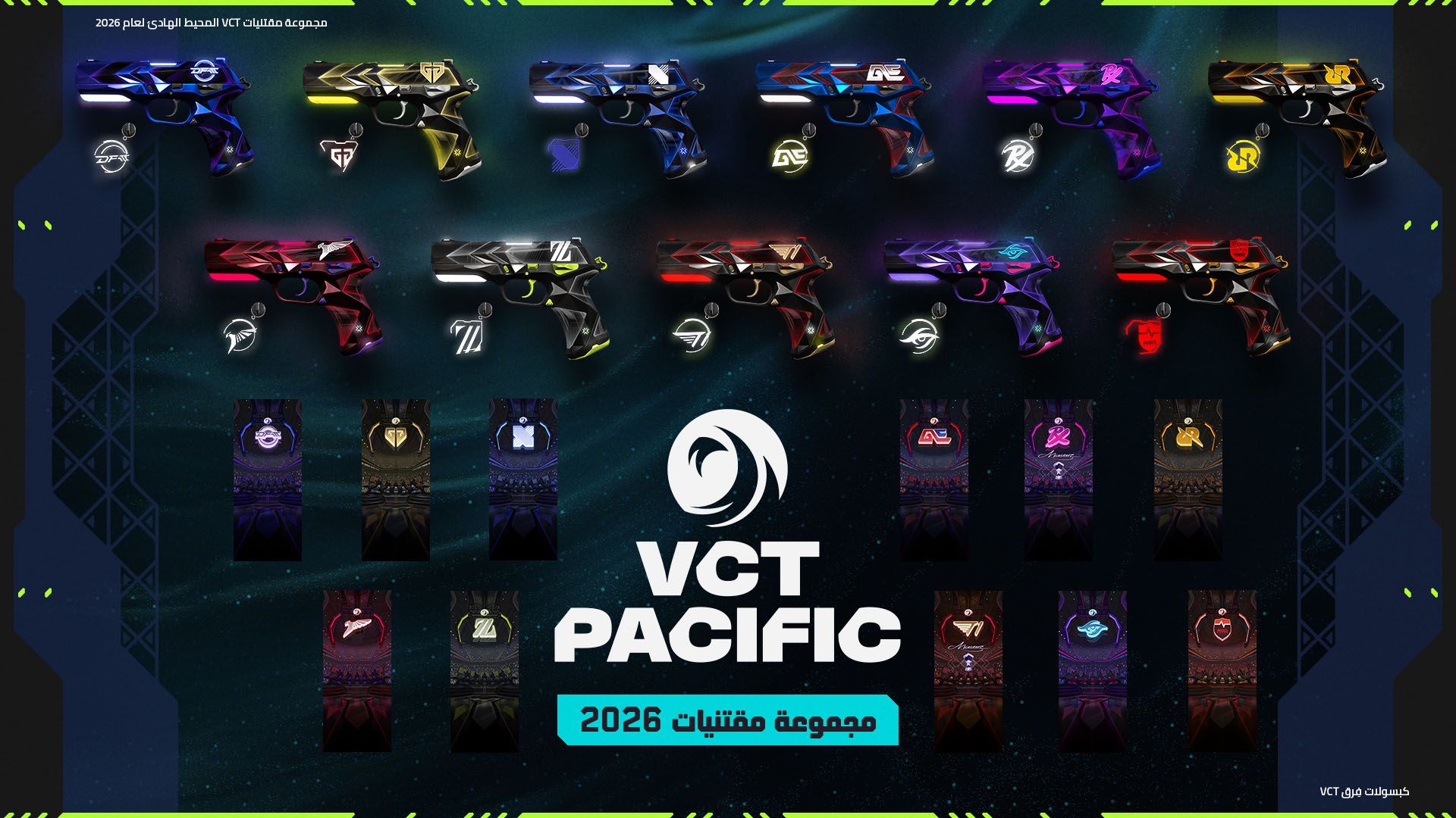 أتى عام 2026 ومعه التزامنا التام بالاحتفاء بحماس المشجعين ودعم الفِرق المشاركة في الدوريات الإقليمية لموسم VCT من مختلف أنحاء العالم. ويسعدنا اليوم تقديم كبسولات فِرق VCT لعام 2026؛ حيث صُممت لمنح اللاعبين سبلًا ذات معنى لتمثيل الفِرق التي يحبونها، مع دعم نجاحهم مباشرةً على مدار الموسم.