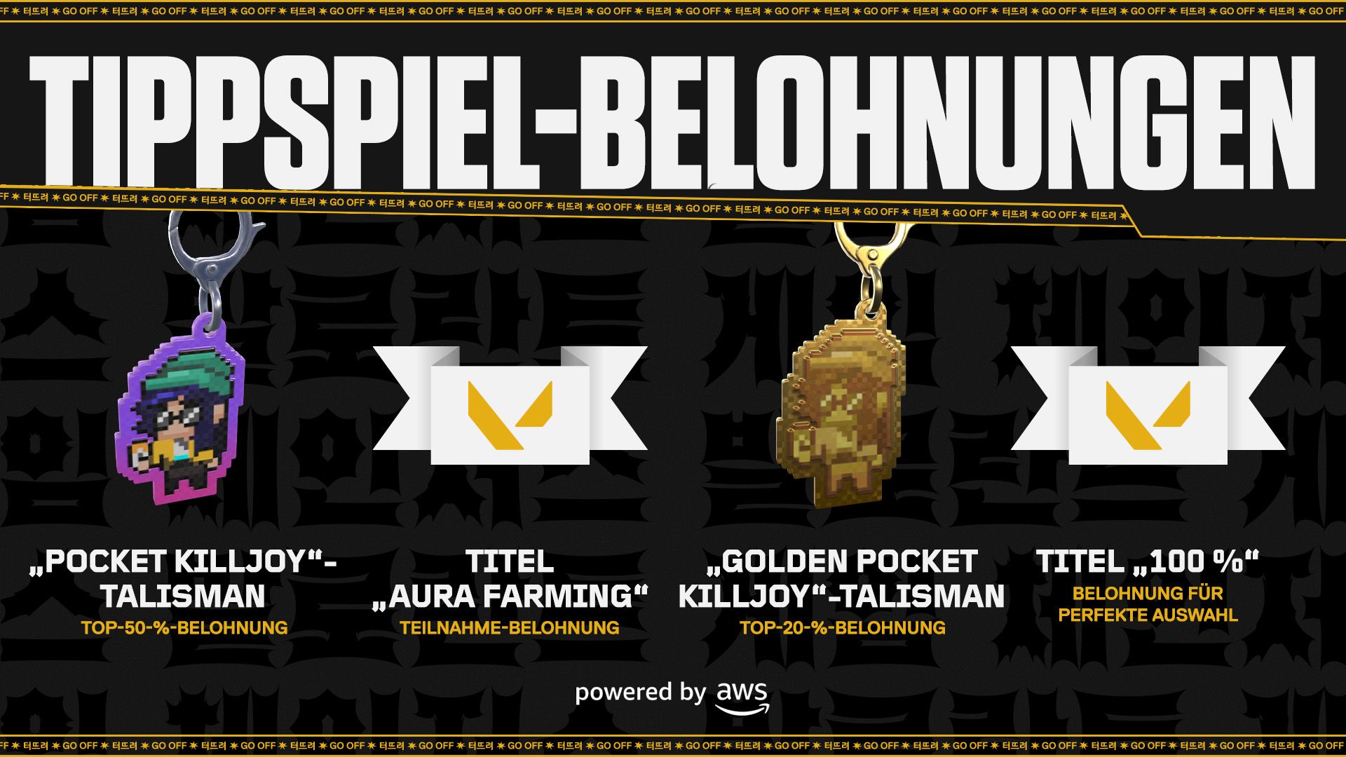Das „Pick‘Ems“-Tippspiel zur Game Changers Championship ist verfügbar in allen Regionen, mit Ausnahme von Kuba, Iran, Nordkorea, Krim, Donetsk, Luhansk, Sudan, Venezuela, Syrien, China, Quebec, Myanmar und allen anderen Regionen, in denen dieses Angebot keine Gültigkeit hat, und erfordert ein gültiges Riot-Konto zum Spielen und Erhalten von Belohnungen. Die Berechtigung zum Erhalten von Preisen und Belohnungen kann je nach Weltregion aufgrund der Regulierungsbestimmungen vor Ort variieren.