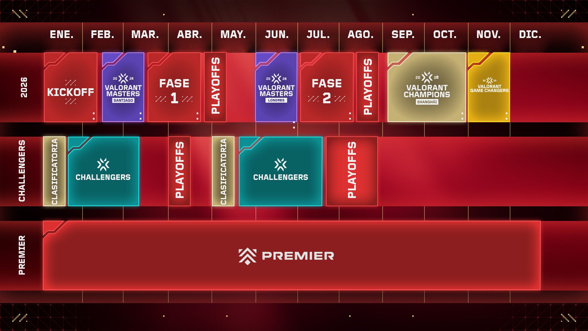 Ahora que se acerca el final de la temporada 2025, estamos listos para compartir más detalles sobre la temporada 2026 de VALORANT Esports. 2026 traerá más eventos, formatos nuevos y una oportunidad increíble para que los equipos de Challengers tengan la oportunidad de conseguir el trofeo de Champions.