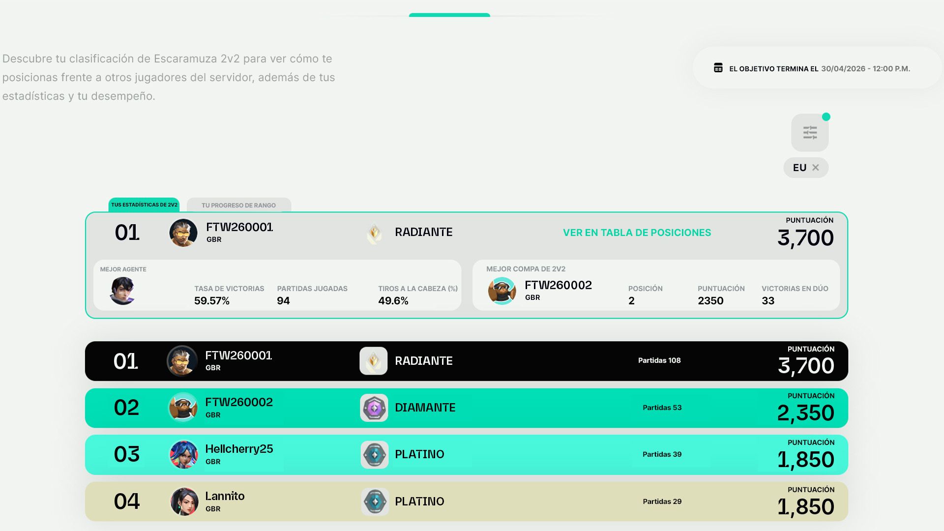 La clasificación está disponible en el sitio de FTW, donde pueden registrar su progreso y ver su rango. El sistema de clasificación es el mismo que el del juego, desde Hierro a Radiante. Solo deben conectar tu cuenta de FTW y comenzar a jugar. Al finalizar el evento, pueden reclamar sus recompensas dentro del sitio web de FTW.