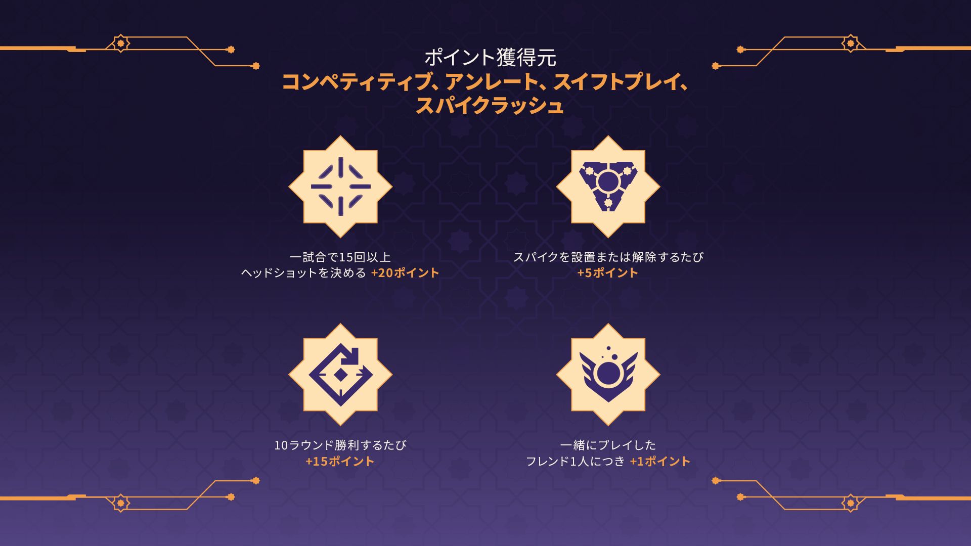コンペティティブ、アンレート、スイフトプレイ、スパイクラッシュをプレイして以下の内容を達成するとポイントを獲得できます: