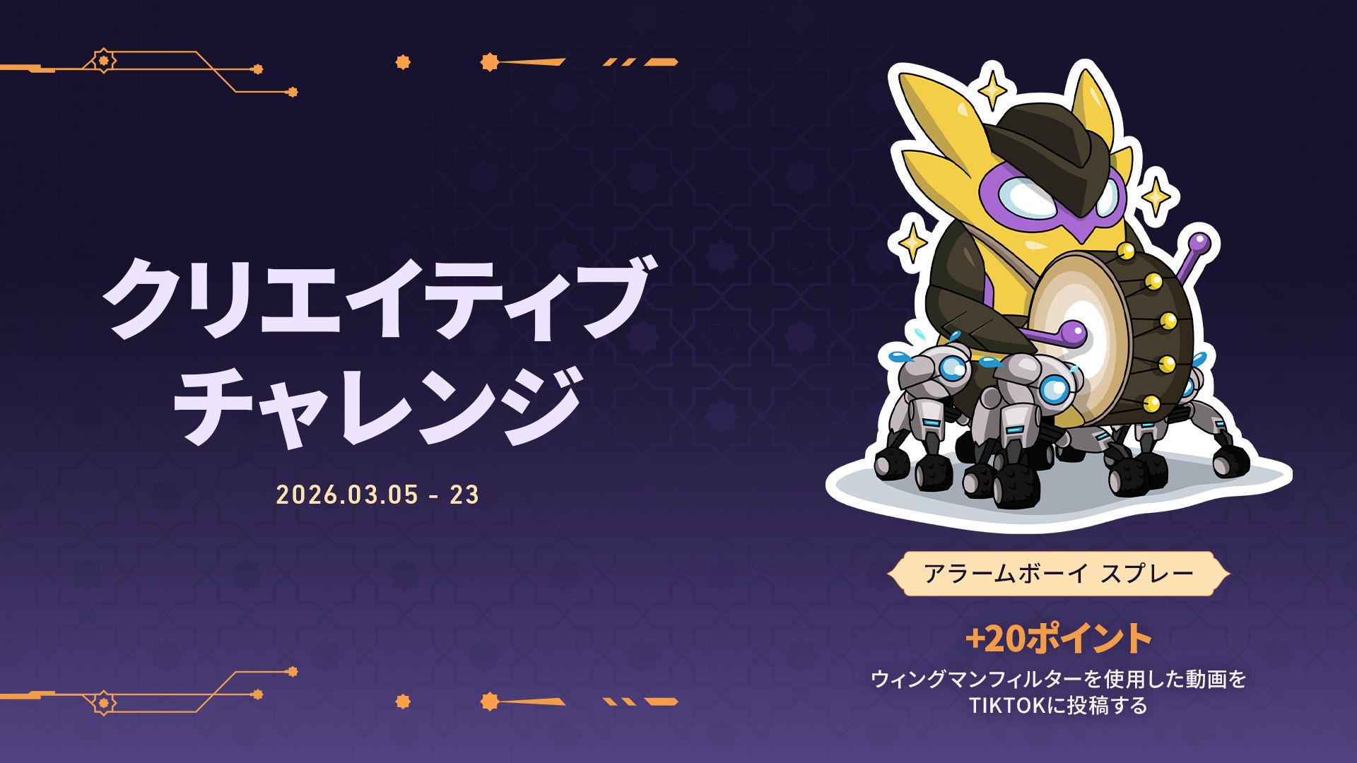 3月5日から23日の間に動画を送信する:20ポイント(イベント期間を通じて1回まで)。イベント終了後、アラームボーイ スプレーもアンロックされます。
