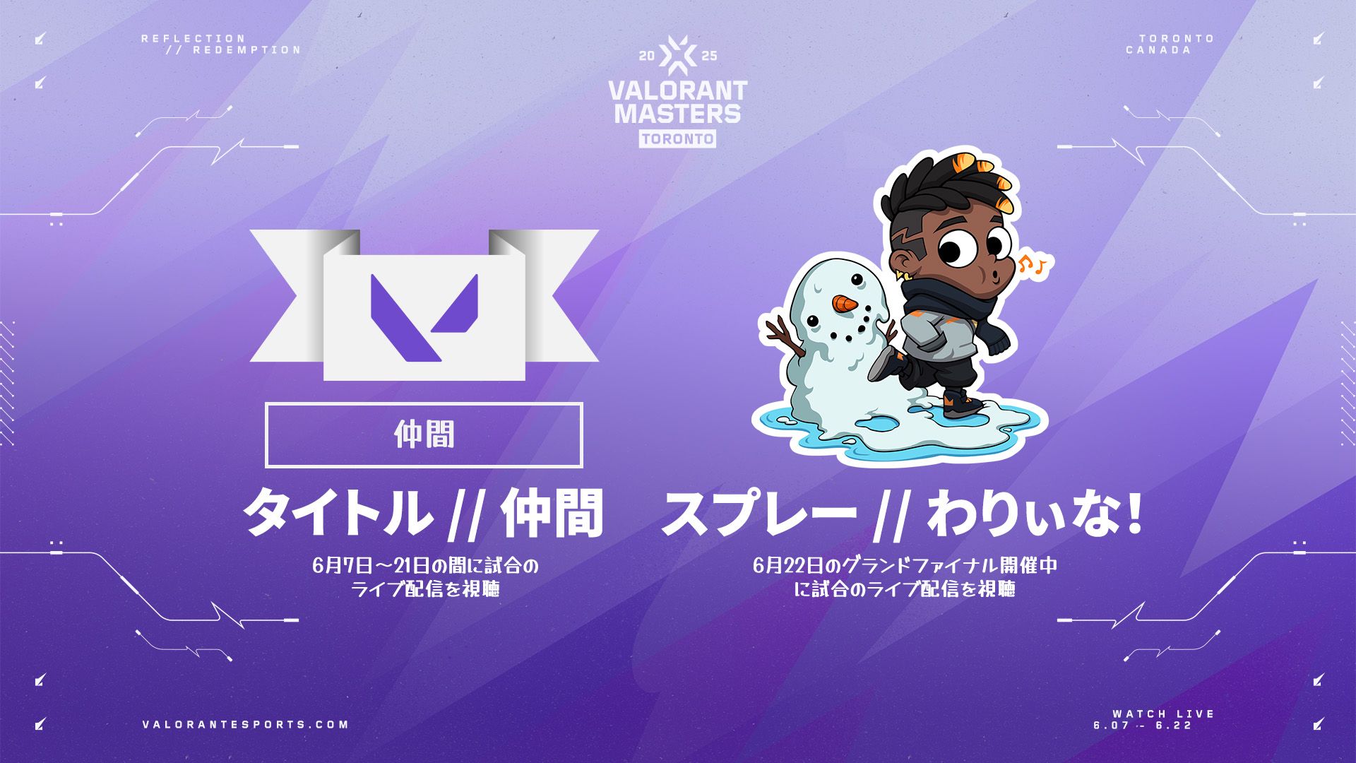いよいよ開催するMasters Torontoを世界中のファンと楽しもう!試合のライブ配信を視聴すると限定タイトルを獲得でき、さらにグランドファイナルを視聴すると特別なスプレーをアンロックできます。
