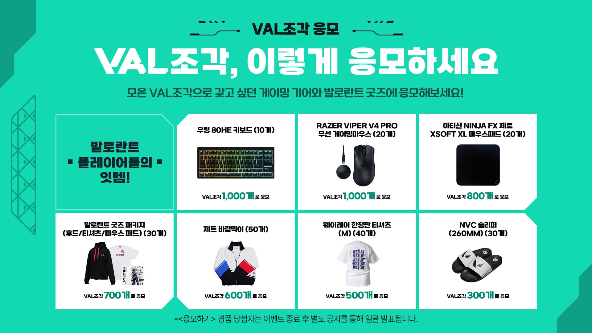 VAL조각 응모 경품 | 1,000 | 우팅 80HE 키보드 (10개) | 응모 (이벤트 종료 후 추첨) | ||