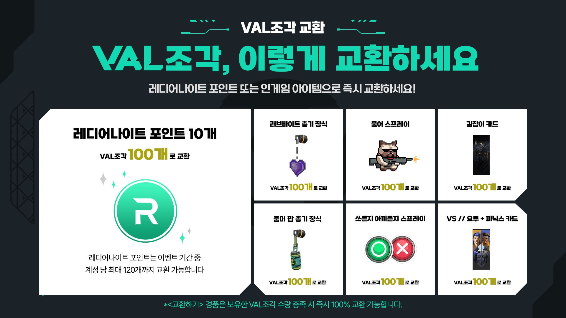 VAL조각 교환 상품 | 100 | 레디어나이트 포인트 10개 | 교환 (최대 120개) | ||