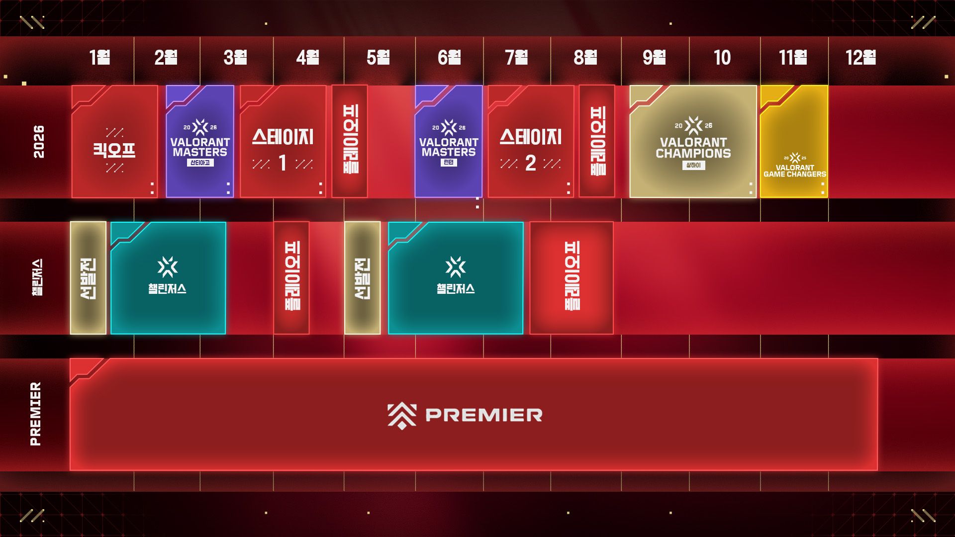 2026 시즌은 잊지 못할 한 해가 될 것입니다. 더 많은 국제 대회와 더욱더 치열해지는 대회 진행 방식, 마스터스 확대, 그리고 챔피언스로 가는 길이 새롭게 신설되어 더 많은 팀을 초대합니다. 이번 변화는 발로란트 e스포츠의 다음 시대를 여는 신호탄이자, 한층 더 개방된 발로란트 챔피언스 투어를 만들어 나가는 출발점입니다.