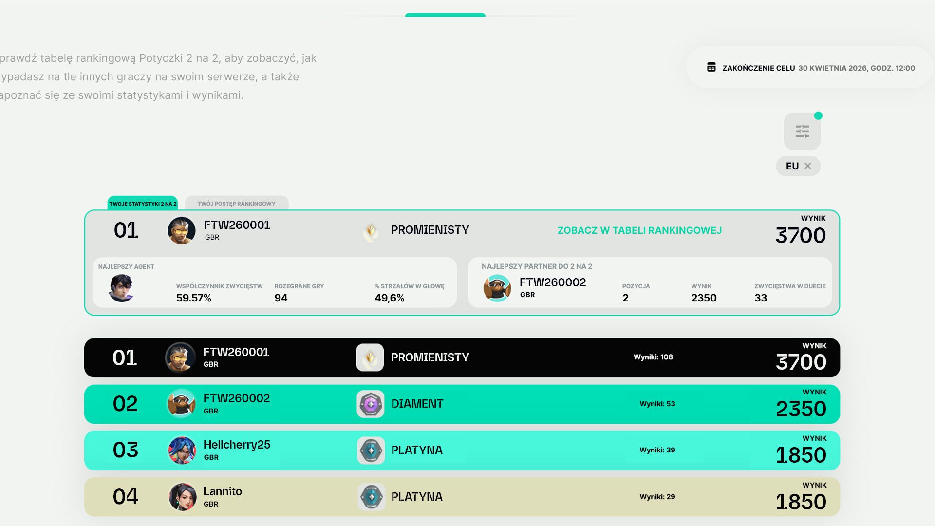 Potyczka obejmuje oddzielne tabele rankingowe dla trybów 1 na 1 i 2 na 2. Rankingi są śledzone niezależnie dla każdego z nich i nie są ze sobą powiązane. Aby pojawić się w odpowiedniej tabeli rankingowej, musisz grać w dany tryb. W przypadku remisu gracz, który rozegrał więcej meczów, zajmie wyższą pozycję w tabeli rankingowej. Aktualizacja twojej pozycji w rankingu na stronie internetowej może potrwać kilka godzin, więc jeśli jeszcze nie została wprowadzona – poczekaj chwilę!
