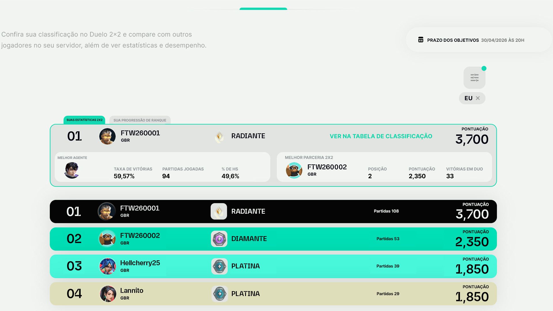 A tabela de classificação ficará disponível no FTW, onde será possível acompanhar o progresso e o ranque de cada jogador. Já o sistema de ranques será semelhante ao que já temos no jogo, indo do Ferro ao Radiante. Para acessar tudo isso, só será preciso vincular sua conta ao FTW e jogar. Quando o evento acabar, será possível resgatar as recompensas obtidas acessando o FTW.