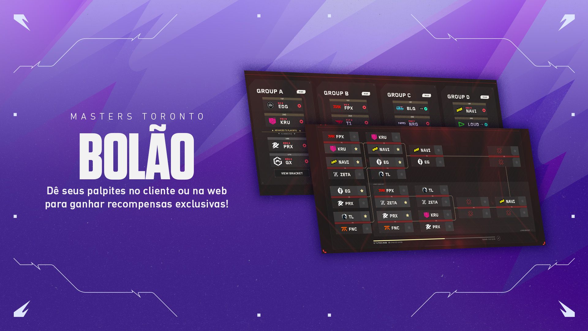 Você encontrará o Bolão no cliente a partir de 28 de maio, na versão 10.10, na aba Esports. Se não estiver em casa, não se preocupe: você também pode jogar em valorantesports.com/pickems.