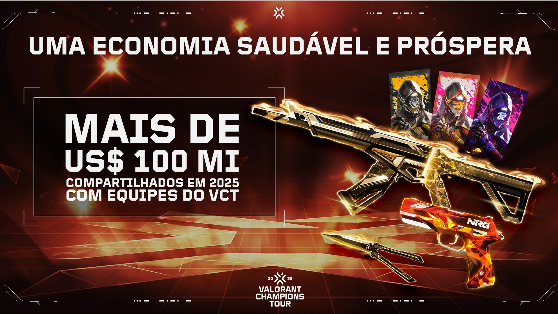 Entre as cápsulas da temporada, cápsulas de equipe e a coleção Champions, construímos um portfólio robusto que permite aos jogadores se expressarem como fãs e fazerem parte dos maiores momentos do nosso esporte. Seu engajamento nos dá confiança para continuar investindo e construindo um futuro sustentável para o VCT.
