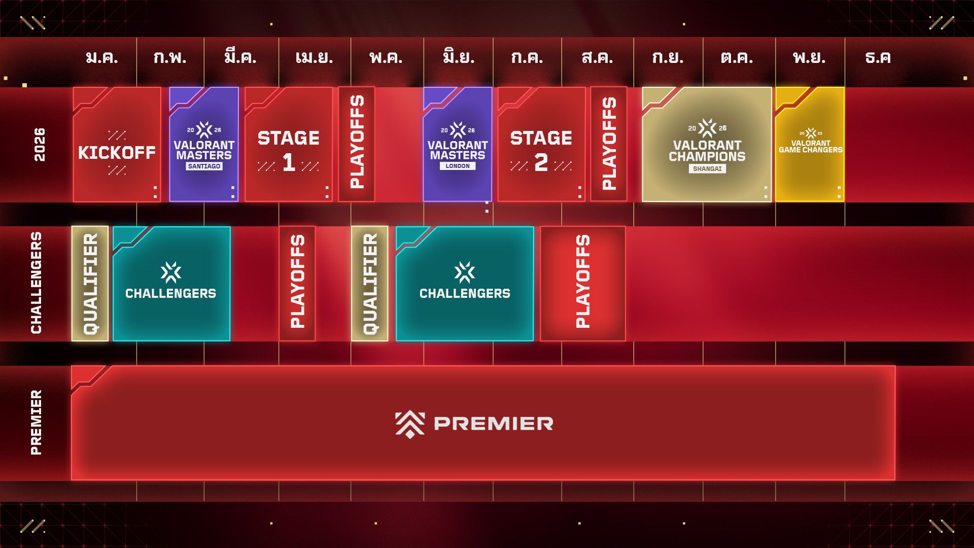 เราจะเผยรายละเอียดการแข่งขันของแต่ละภูมิภาคภายในปีนี้ ดูข้อมูลเพิ่มเติมเกี่ยวกับวิธีการเข้าร่วม Challengers ผ่าน Premier ได้ในคำแนะนำจากซีซั่นทีผ่่านมาของเรา