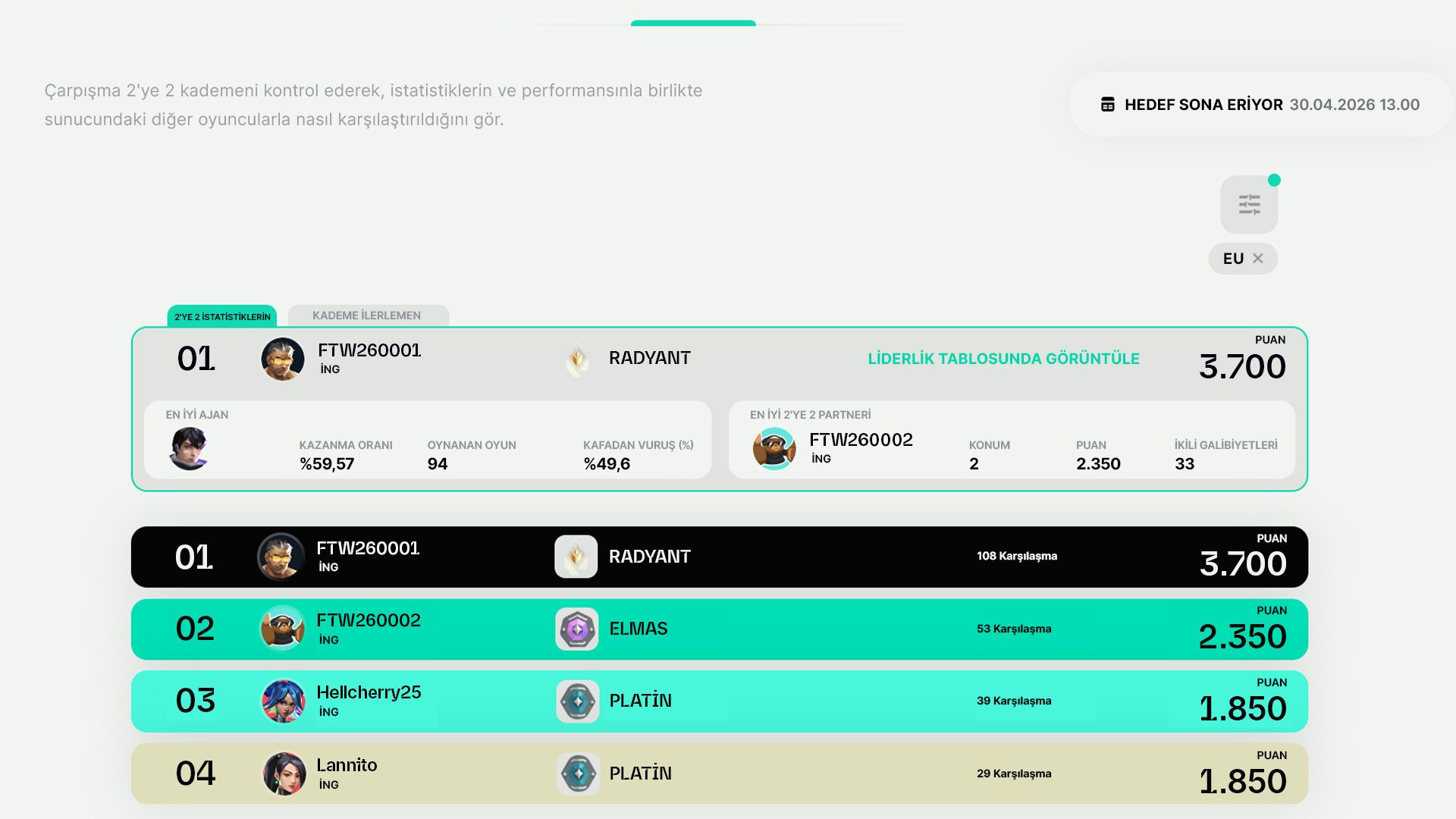 Rekabete dayalı sıralama FTW'nun internet sitesinde yer alacak. Burada ilerlemenizi ve kademenizi görebileceksiniz. Kademe sistemi Demir'den başlayıp Radyant'a kadar uzanarak oyun içindeki sisteme benzeyecek. Tek yapmanız gereken hesabınızı FTW'ya bağlayıp oyun oynamak. Etkinlik sona erdiğinde FTW'nun internet sitesine giderek ödüllerinizi alabilirsiniz.