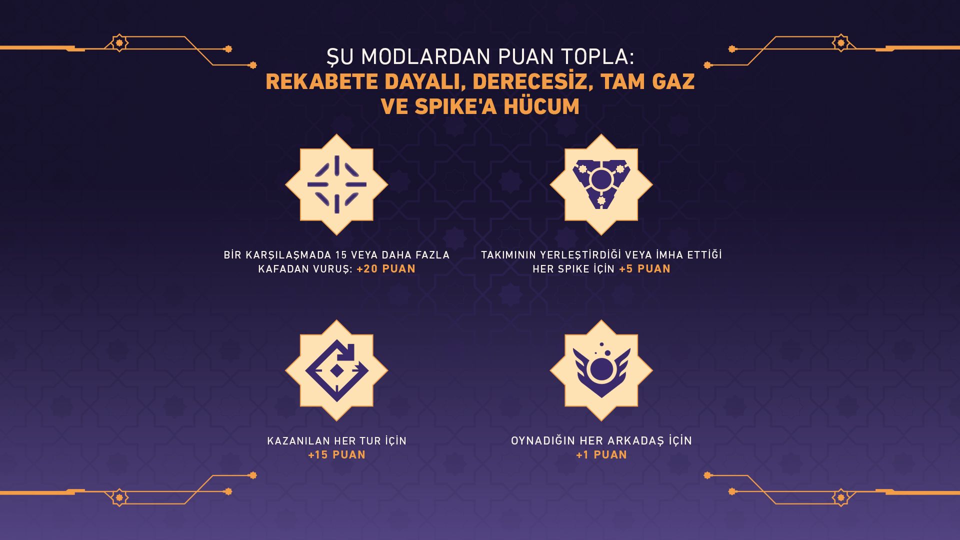 Rekabete dayalı, derecesiz, Tam Gaz, Spike'a Hücum modlarında şunları başararak puan kazanın: